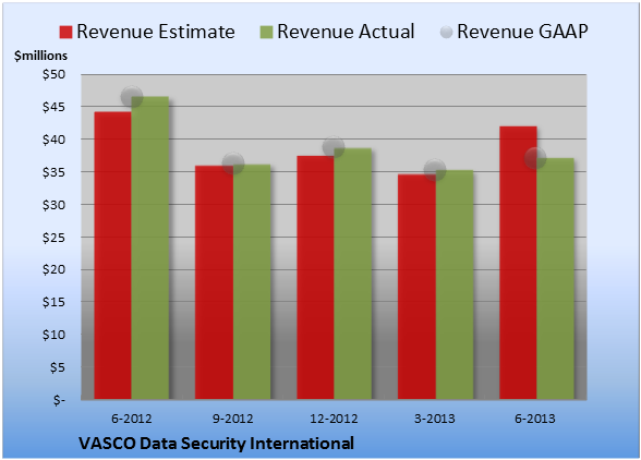 VASCO Data Security International chalked up revenue of $37.3 million. The four analysts polled by S&P Capital IQ anticipated revenue of $42.2 million on the same basis. GAAP reported sales were 20% lower than the prior-year quarter's $46.6 million.