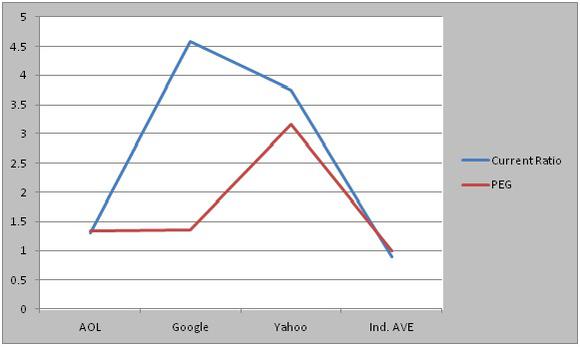 AOL's current ratio (which measures a company's assets versus its liabilities) suggests it is just meeting its operational needs. Furthermore, AOL is lagging behind Google, Yahoo!, and MSN. It needs Huffington Post to turn a profit. AOL's high P/E ratio may be due to high expectations for future growth in earnings after turning a profit for the first time in five years. AOL's stock is a tick overvalued, according to its price/earnings/growth ratio. However, it is not as overvalued as Yahoo!'s PEG. But, its PEG is higher than both Google's and the industry average.A stock's PEG ratio gives an investor an apples-to-apples comparison of two companies that would be a ludicrous assessment (like AOL and Google). However, PEG ratio gives a more clear understanding of a stock's value in conjunction with the competition's P/E ratio. A stock with PEG ratio above one suggests the market expects the stock to grow higher than expected, or share demand overvalues the stock, while a PEG ratio below one suggests the market underestimates its growth and is undervalued, or analysts' consensus estimates are set low.
